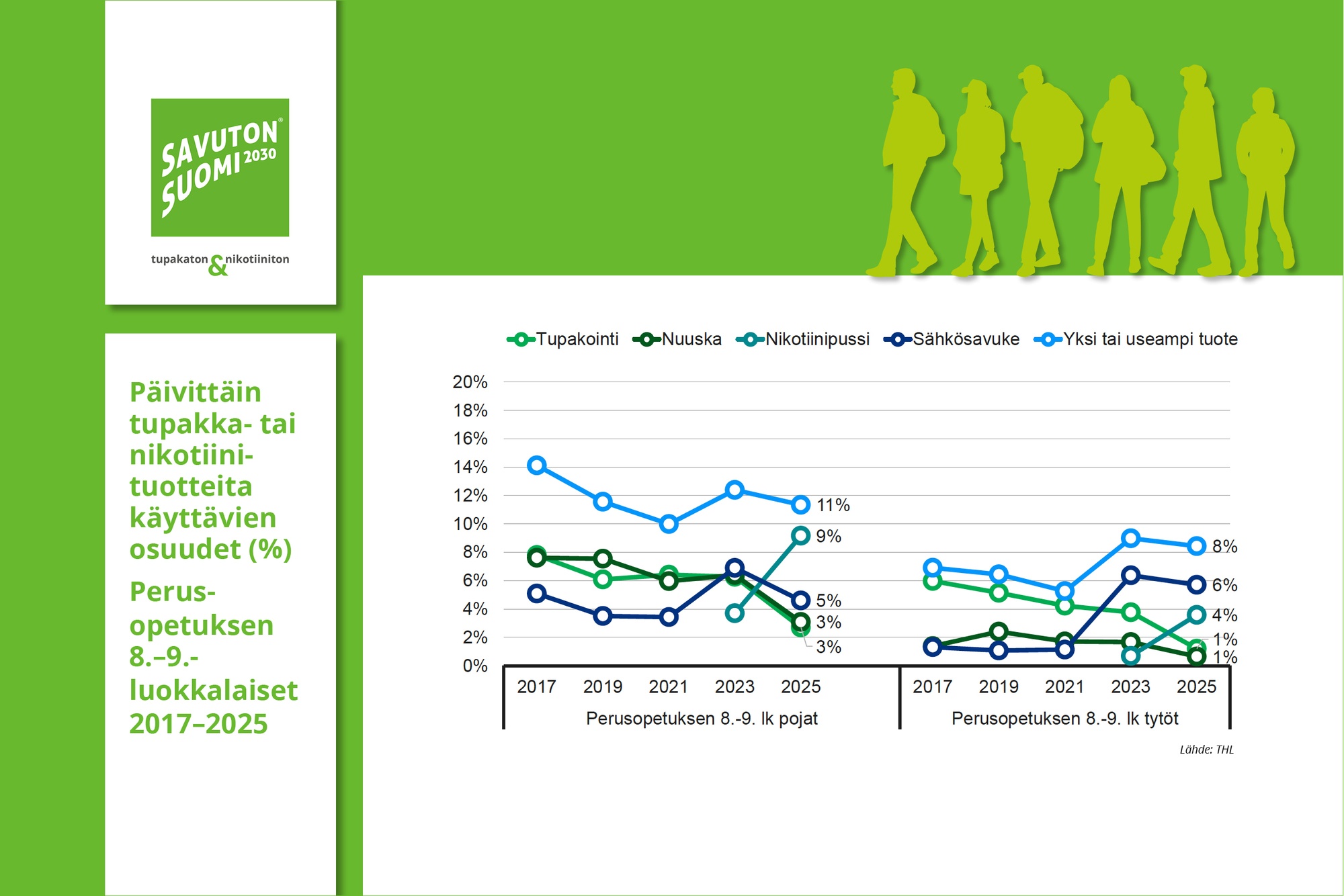 Päivittäin tupakka- tai nikotiinituotteita käyttävien osuudet (%) Perusopetuksen 8.–9. -luokkalaisilla, 2017–2025