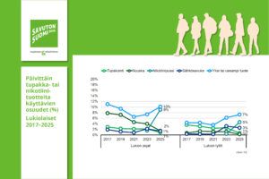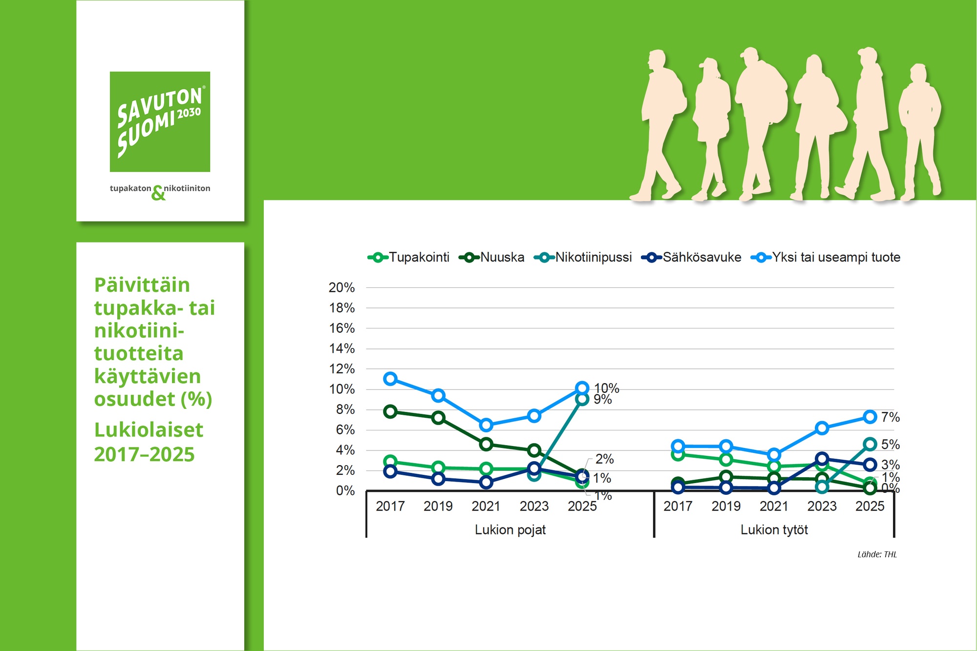 Päivittäin tupakka- tai nikotiinituotteita käyttävien osuudet (%) lukiolaisilla, 2017–2025
