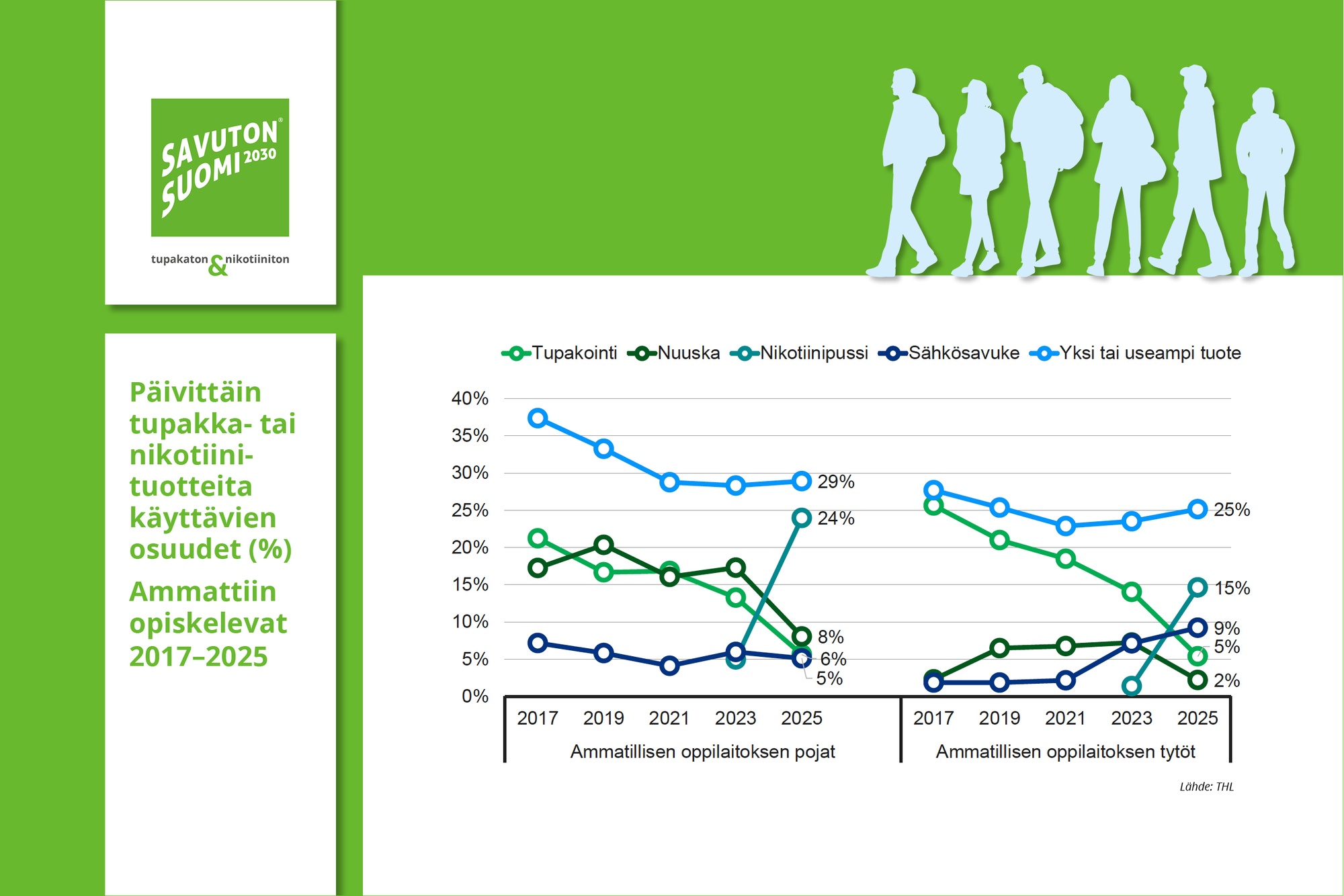 Päivittäin tupakka- tai nikotiinituotteita käyttävien osuudet (%) ammattiin opiskelevilla, 2017–2025